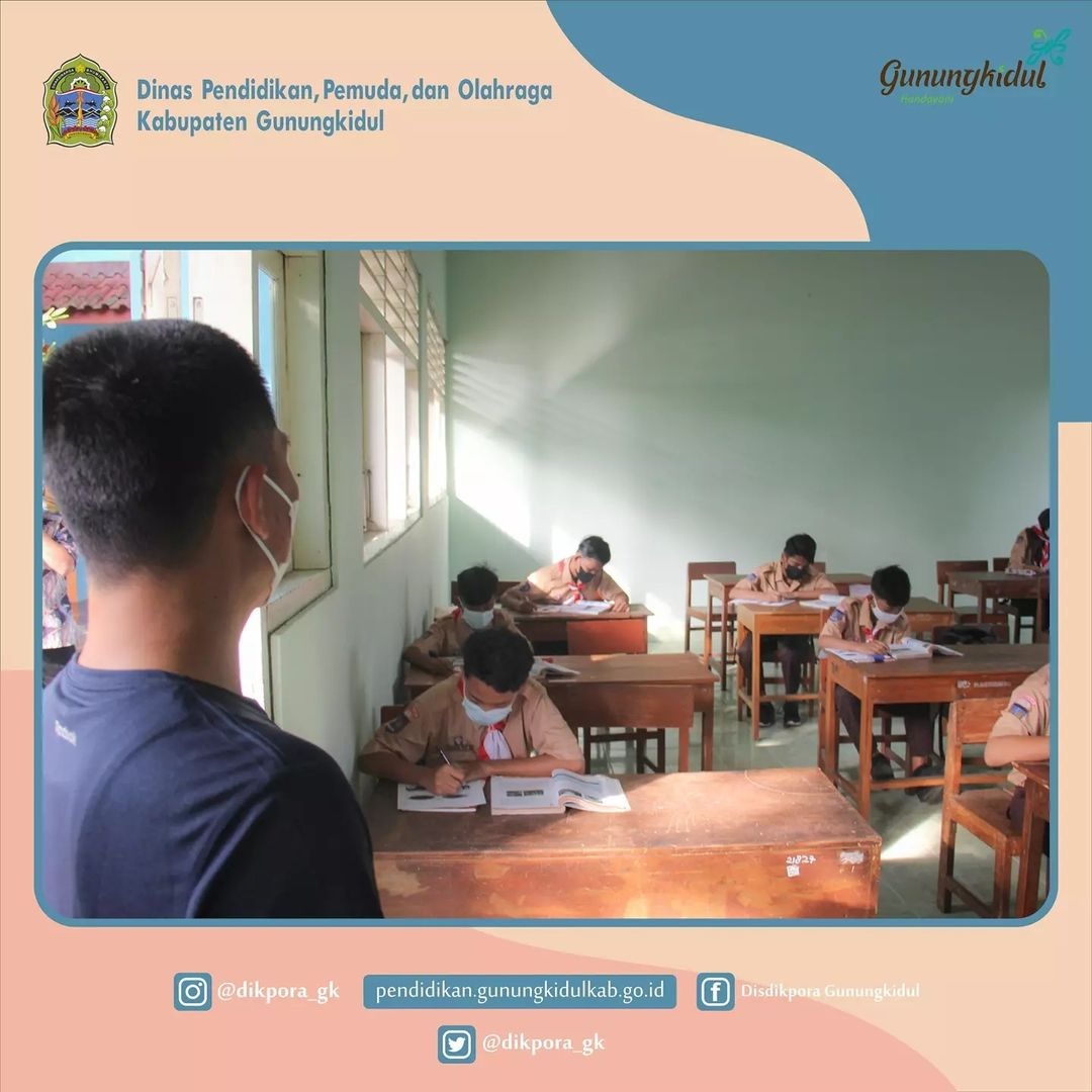 WONOSARI- H. Sunaryanta selaku Bupati Gunungkidul mengunjungi Sekolah Dasar (SD) Negeri Wonosari 6 dan Sekolah Menengah Pertama Negeri 2 Wonosari. Kunjungan tersebut dalam rangka memantau langsung kegiatan Pembelajaran Tatap Muka (PTM) yang dilaksanakan di Kabupaten Gunungkidul. Turut serta dalam kegiatan tersebut Drs. Ali Ridlo, M.M. selaku Pelaksana Tugas (PLT) Kepala Dinas Pendidikan, Pemuda, dan Olahraga (Disdikpora) Kabupaten Gunungkidul, Sumarto, S.Pd., M.M. Selaku Kepala Bidang Sekolah Dasar, dan Kisworo, S.Pd., M.Pd. selaku Kepala Bidang Sekolah Menengah Pertama.